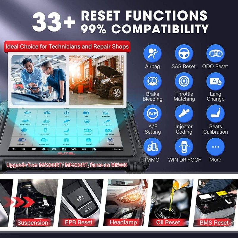 MaxiSYS MS906Pro es una tableta de diagnóstico avanzada compatible con vehículos estadounidenses, asiáticos y europeos, 1996 y posteriores. Esta tableta inalámbrica con pantalla táctil basada en Android de 8 pulgadas realiza diagnósticos completos del vehículo, incluido un escaneo de todos los sistemas con identificación ADAS, la capacidad de leer/borrar códigos, ver imágenes congeladas y datos en vivo, control bidireccional que incluye pruebas activas, codificación y adaptaciones. Incluye escaneos previos y posteriores personalizables, amplio menú de servicio con 25 de las tareas de mantenimiento más comunes. Acceso FCA a través de la cuenta AutoAuth, análisis del sistema de arranque y carga con el probador Bluetooth MaxiBAS BT506 y la compra de cables terminales, capacidad de calibración ADAS (se requiere actualización del sistema y software).